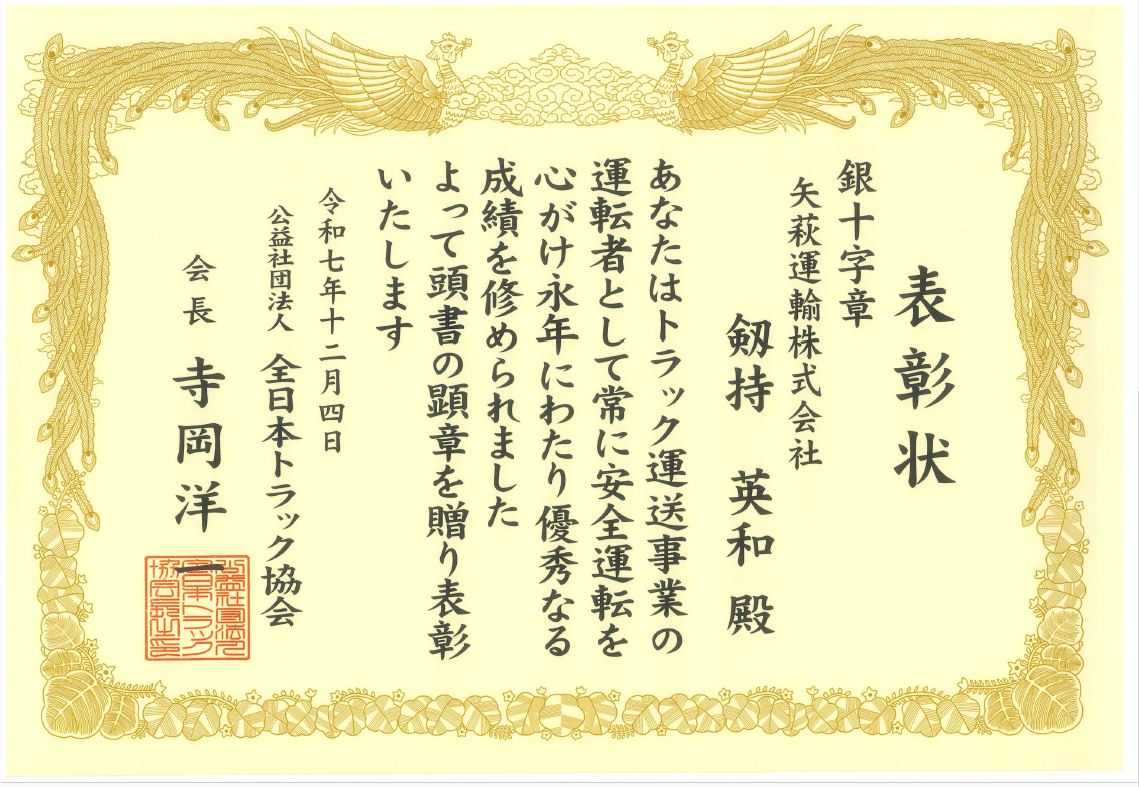 昨年に引き続き、弊社の運転手が全日本トラック協会から優秀運転者顕章(銀十字章)を2人が受賞いたしました。 おめでとうございます!